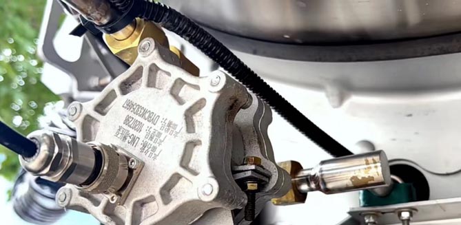 为了便于观察气瓶的压力,气瓶配备了压力表。首先是上部的气瓶压力表,它的作用是实时显示气瓶内部的压力,再有就是下部的缓冲罐压力表,它的作用是显示供给发动机燃气的压力。一般情况下,两块表的压力是一致的,偏差0.3兆帕也是正常现象。
