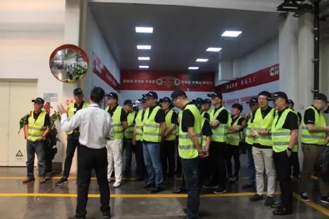 考察团在总装车间外合影