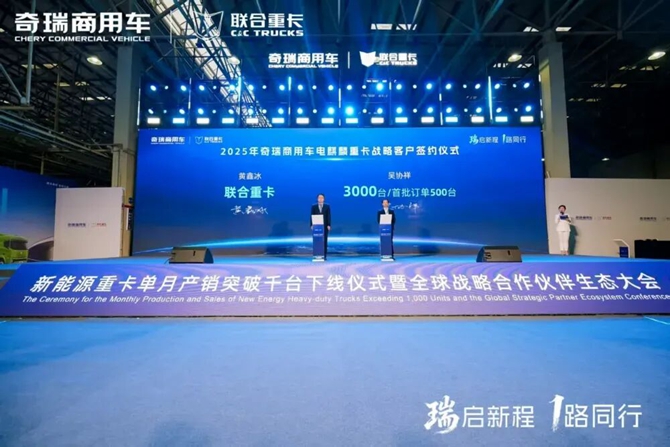 2025年11月7日,奇瑞商用车联合重卡超级工厂内光影璀璨、掌声雷动,以“瑞启新程1路同行”为主题的奇瑞商用车新能源重卡单月产销突破千台下线仪式暨全球战略合作伙伴生态大会隆重举行。奇瑞控股集团董事长尹同跃出席大会并作主旨演讲。