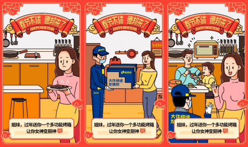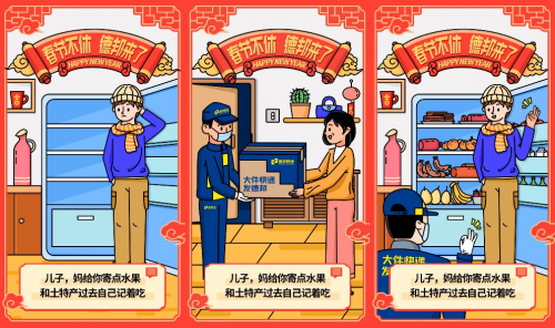 以原地过年为背景,这组GIF海报不仅高度还原春节期间,广大用户收到年货的系列场景,感受到“团圆”的温暖,还以异地过年为情感共鸣点,让消费者从中嗅到记忆中那份独特的年味儿。