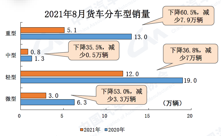 据中汽协分析,造成产销进一步大幅下降的原因主要是,今年7月1日重型柴油车国六排放法规的切换,导致市场需求出现了较大的波动,进而使本月商用车销量呈现明显的前高后低态势。同时,鉴于2020年受疫情影响的市场情况特殊,3月后产销基数较大并不具参考价值。因此,与2019年8月相比,商用车产销同比下降23.1%和19%,增速比7月已由正转负。而与2019年1~8月产销相比,商用车产销同比增长20%和23.8%,增幅比1~7月均回落5.2%。