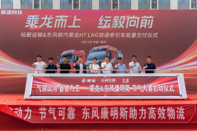 凭借优异的动力链及整车性能,乘龙H7 LNG牵引车在气耗方面也走在行业前列。为了进一步为客户降本增效,提供全生命周期的运输解决方案,此次交付仪式现场,东风柳汽联合东风康明斯、纭毅运输共同启动“气领山河 省者为王——乘龙&东风康明斯 节气大赛”,搭载康明斯发动机的乘龙H7燃气车型,并且有固定运营线路的车辆均可参与此次节气挑战活动,成绩优秀的卡友还将会获得至高2000元的奖励。